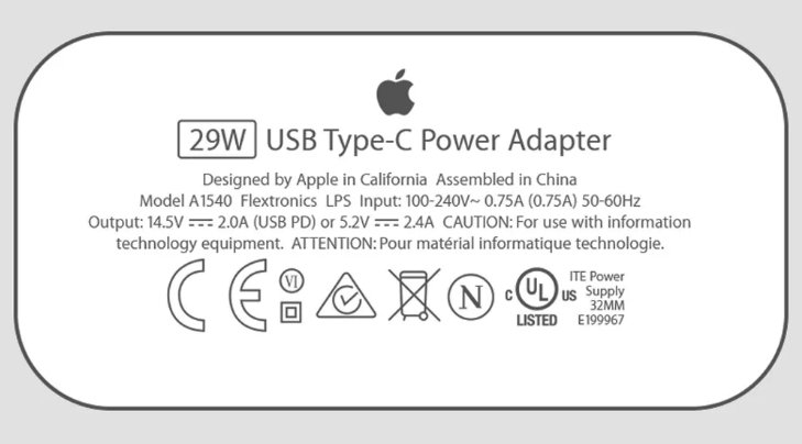 Если вы не уверены, какой именно адаптер питания USB-C есть у вас в наличии, посмотрите информацию, указанную на его нижней стороне: