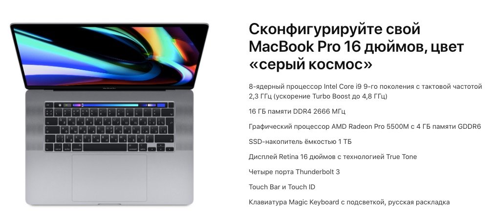 Существует несколько способов получить информацию о всех возможностях индивидуальной сборки Mac. Для этого существуют специализированные ресурсы, на которых указаны все варианты комплектации, например, everymac.com. Самый же простой и доступный метод — воспользоваться конфигуратором на сайте apple.com. Давайте рассмотрим его на примере MacBook 16”.